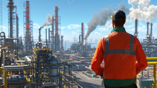 Back view of the logistics coordinator who inspects the bright oil refinery.