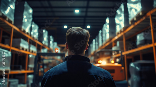 Back View of Worker Standing in Large Industrial Distribution Warehouse with Shelves