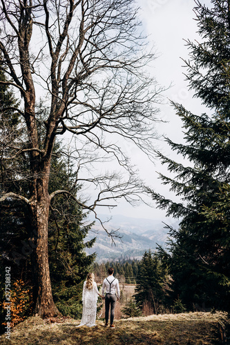 Back view on the Caucasian fiance and fiancee standing at the picturesque meadow in the countryside on the misty autumn day and looking at the mountains. Rear.