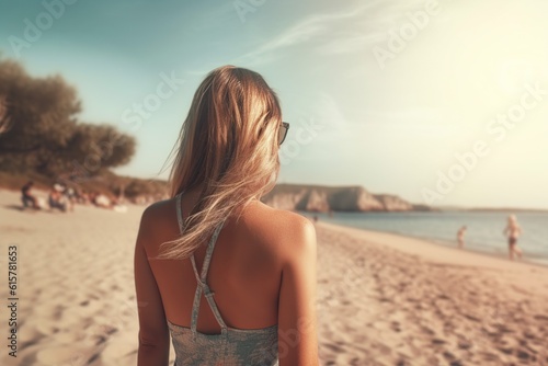 Back view, Woman on beach in summer by generative ai