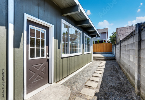 Back yard house exterior with gravel walkway and brick fence