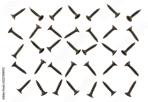 Background of black screws on a white background. Pattern of screws.