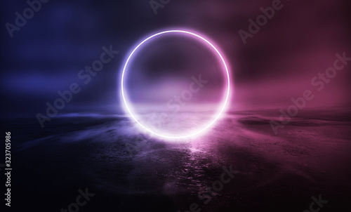Background of empty stage show. Neon blue and purple light and laser show. Laser futuristic shapes on a dark background. Abstract dark background with neon glow