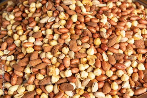Background texture of assorted mixed nuts including cashew nuts,