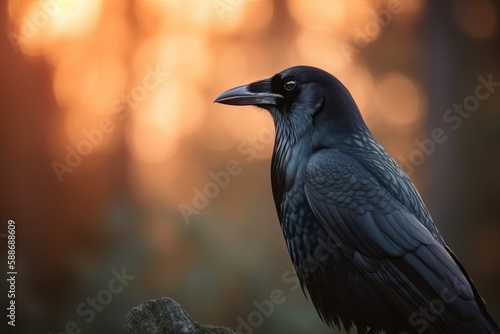 Back-lit scene of a beautiful Raven, Rook sitting alone in a woodland setting.