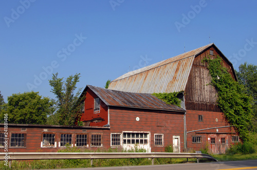 for sale, new york city, two-story, barn, red, wooden, weathered, old, ageing, ivy, covered, roadside, painted, loft, road, highway, colourful, travel, tour tourism, exterior, picturesque, roof, tin, window, long, sunny, blue, sky, dilapidated, abandoned, derelict, forgotten, cracked, peeling, broken, architecture, agriculture, historic, shingle, shingle, antique, country, rural, front