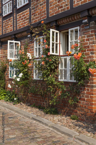 Backsteinfassade mit Rosen, Niedersachsen, Deutschland
