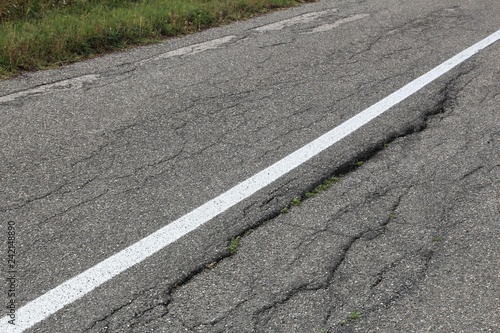 road, route, way, blacktop, hole, damage, damaged, broken, defective, fractured, crack, cracked, condition, bad, old, aged, construction, pavement, weathered, europa, european, italy, italian, basilicata, drive, infrastructure, structure, maintenance, pothole, patched, patch, dangerous, tarmac, rural, countryside, roadway, quality, low