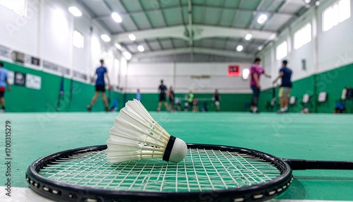 Badminton racket and shuttlecock on green court with players in background—indoor sports facility captures essence of game, equipment focus, and active recreational environment.
