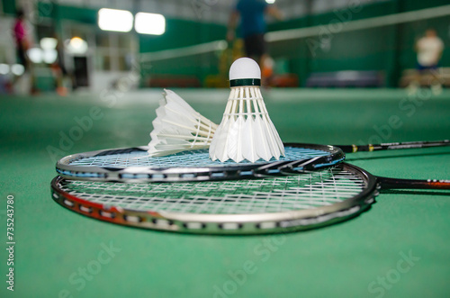 Badminton rackets and white cream badminton shuttlecocks after playing or after games on green floor in indoor badminton court soft focus concept for badminton lovers around the world.