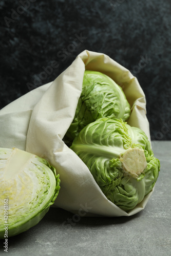 Bag with fresh green cabbage on gray table