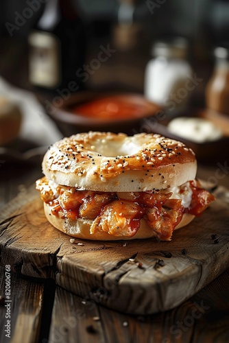 Bagel au poulet gourmand, avec de la salade et du cheddar, illustration culinaire ia générative