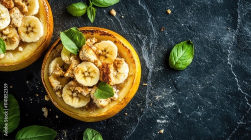baked, apple, dessert, banana, toast, mini, basil, leaf, dark, stone, background, top, view, food, sweet, culinary, epicure, fruit, slice, plate, healthy, snack, receipe, brunch, natural, delicious, autumn, vegan, style, contemporary, edible, decorative, kitchen, homemade, fresh, tasty, vibrant, rustic, arrangement, indulgent, seasonal, appetising, photo, closeup, presentation