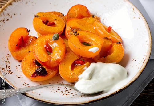 grilled, food, fruit, apricot, healthy, peach, dessert, summer, sweet, eating, organic, epicure, dinner, grill, vegetarian, freshness, bar-b-q, fresh, ripe, salad, prepared, honey, cream, breakfast, nectarine, table, meal, diet, cooking, lunch, preparation, half, roasted, bowl