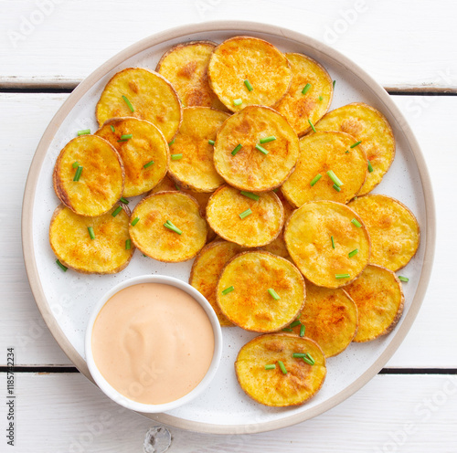 Baked potatoes with sauce. Homemade chips. Appetizer. Snack. Vegetarian food.