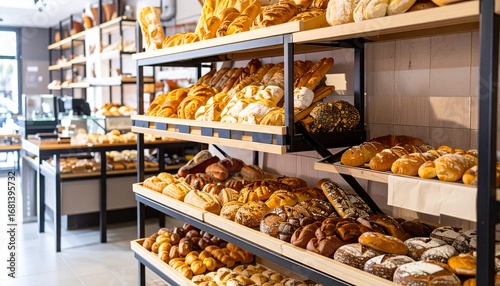 Bakery shop with assortment of bread on shelves. High quality photo