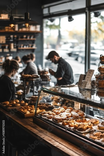 Bakery showcase with pastries and customers.