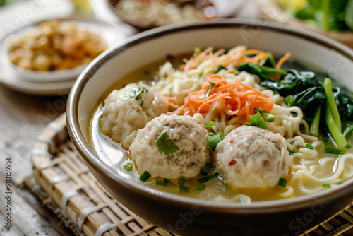 Bakso indonesian soup. Meatball soup. Chicken turkey vegetables meatballs soup with carrots and potatoes.