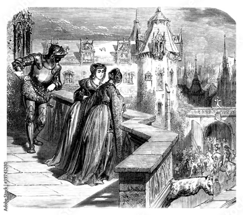 balcony, nobleman, loftiness, scene, crusader, knight, castle, architecture, woman, chat, chat, man, century, hero, warrior, engraving, illustration, mediaeval, middle-ages, fashion, portrait, dress, nobleman, aristocrat, aristocracy, drawing, knighthood, show