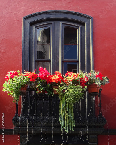 Balcony of an historic colonial facade in the old city center of Santa Cruz. La Palma Island. Canary Islands. Spain.