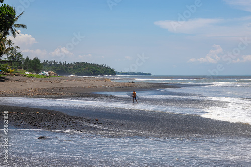 BALI, INDONESIA - NOVEMBER 10, 2022: Male surfer with surfboard spending sunny day on beach near waving ocean in Bali