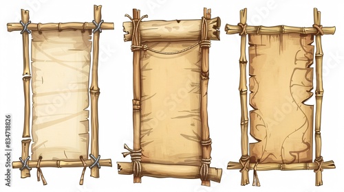 Bamboo structures with aged parchment and rope embellishments in cartoon design, isolated on a white background. For use in game user interfaces or signage.