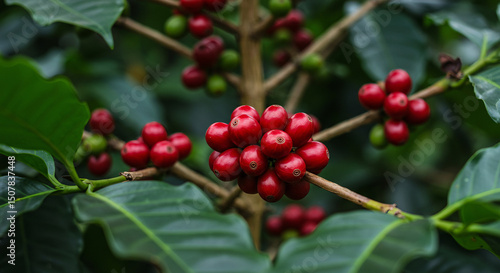 Banner coffee bean berry plant fresh seed. panoramic Ripe Red coffee tree growth green eco organic farm. Banner red ripe seed robusta arabica berries harvest coffee garden. Coffee bean tree copy space