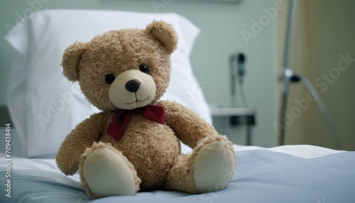 Banner with a teddy bear toy on a patient's bed in a hospital. Children's Medical Center. Healthcare and childhood concept