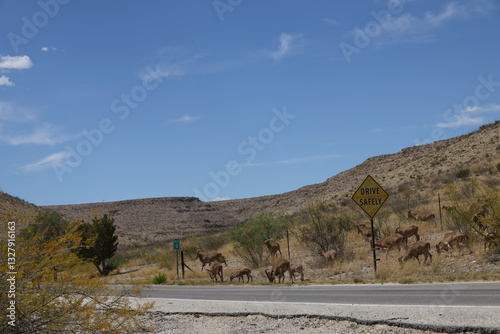 animal, mammal, herd, young, offspring, lamb, children, juvenile, wild, wildlife, multiple, many, wilderness, rock, horn, desert, animal, nature, buck, bull, blue skies, white cloud, copy space
