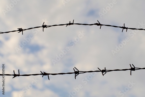 wire, barbed, fence, gaol, sky, barbed wire, security, metal, danger, barb, protection, sharp, barbed wire, blue, steel, barrier, gaol, freedom, border, boundary, iron, military, war, forbidden, hinder, obstruct, spiky, deter