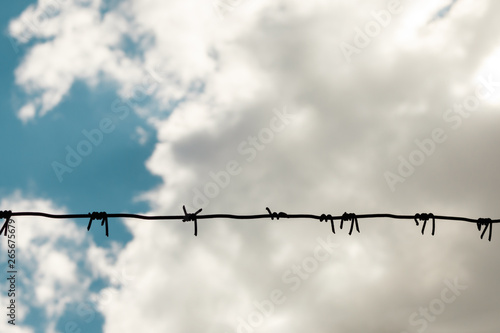 barbed wire against cloudy sky, copy space for text. Imprisonment concept. wire with clusters of short, sharp spikes set at intervals along it, used to make fences or in warfare as an obstruction.