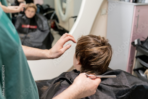 Barber with giving boy haircut