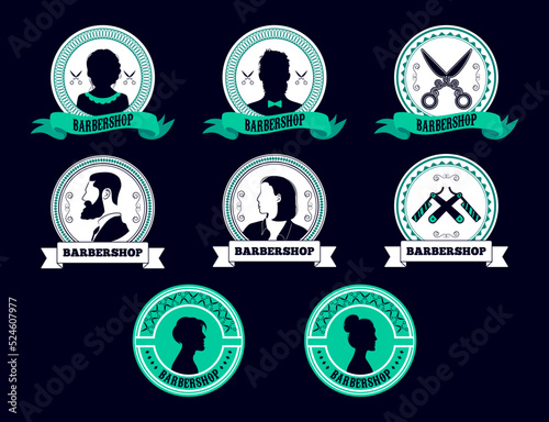 barbershop, logotype, hair, salon, hairdresser, barber, emblem, profile, woman, man, afro, african, american, company, head, lady, badge, beard, razor, scissors, shave, service, sticker, ribbon, haircut, beauty, face, male, coiffure, female, model, hairdresser, hairdresser, business, hipster, shop, brand, circle, silhouette, retro, label, round, vintage, signs, vector, icon, template, green, design, set