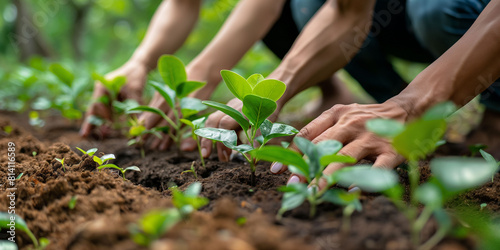Bare hands plant a row of young green seedlings in fertile soil, emphasizing hands on environmental action through reforestation, promoting ecological balance and carbon sequestration.