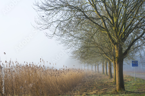 road, mist, haze, fog, moist, winter, cold, field, agriculture, sky, blue, tree, row, perspective, sunlight, nature, landscape, outdoors, countryside, rural, tranquil, scenic, holland