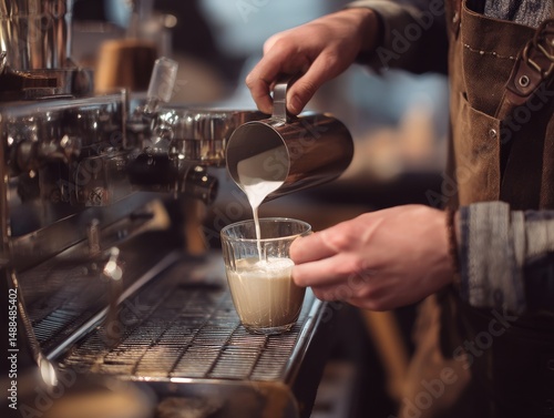 Barista pouring steamed milk into a cup of coffee. Warm, rich tones and a focus on the skillful preparation of the drink.