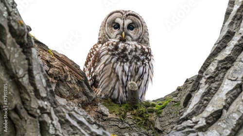 owl, barred, perched, tree branch, tree, feather, bird, wildlife, nature, forest, timberland, eye, grey, bark, beak, talon, wing, wild, animal, sitting, looking, watching, closeup, natural, environment, outdoors, daytime, bright, light, background, green, brown, white, black, yellow, feathery, pattern, texture