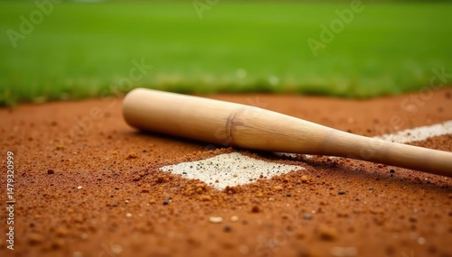Baseball bat resting on dusty home plate, field background, sun, equipment