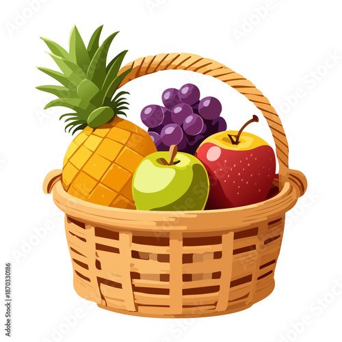 basket, fruit, pineapple, grape, apple, tropical, fresh, healthy, organic, nature, food, wicker, harvest, garden, diet, nourishment, vitamin, sweet, juicy, purple, green, yellow, snack, vegan, vegetarian, illustration, farm, market, grocery, agriculture, summer, delicious, natural, plant, raw, assortment, gift, product