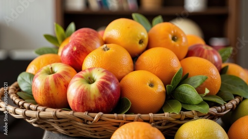 Basket of fresh apples and oranges with green leaves