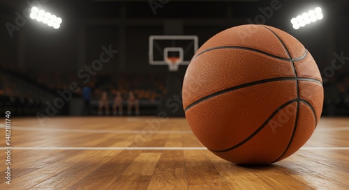 Basketball Ball on Court in Indoor Arena with Spotlights