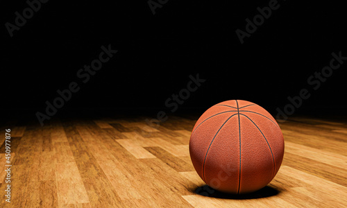 Basketball ball placed on the green playing field. Team sports equipment. 3D rendering