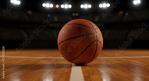Basketball close-up on the court with stadium lights shining brightly above, a dynamic shot of indoor sports