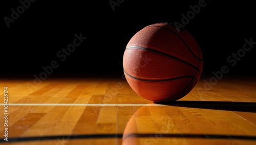 Basketball on polished wood court with dramatic lighting and shadow