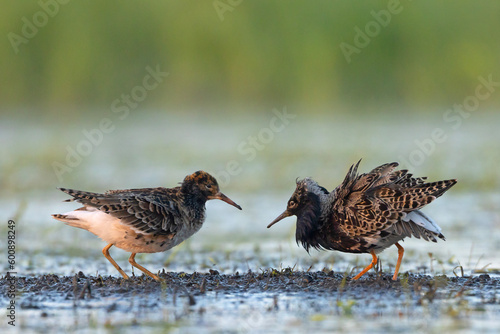 ruff, warrior, bird, animal, male, collar, combat, mating, springtime, mud, bog, meadow, feather, beak, grass, water, nature, environment, protection, ecology