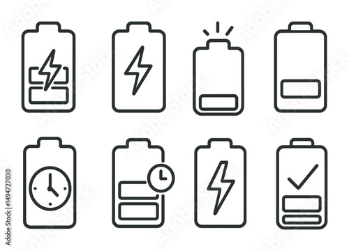 battery, power supply, line, outline, vector, icon, set, electricity, charge, energy, power, line art, voltage, renewable energy, mobile, electric, minimalist, digital, environmentally friendly