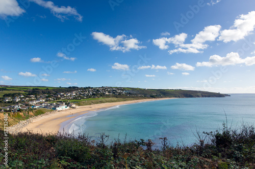 Bay and beach with blue sky Praa Sands Cornwall England