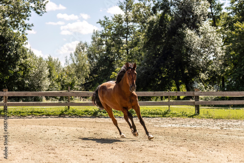 trotter, horse, bay, brown, gallop, pace, paddock, motion, running, dynamic, equine, movement, speed, energy, no people, equestrian, summer, sunlight, arena, training, fence, countryside, farm, ranch, pedigree, gelding, male, performance, athletic, sport, noble, rural