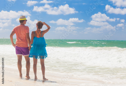 Beach couple walking on romantic travel honeymoon vacation summer holidays romance. Young happy lovers, Cayo Largo, Cuba