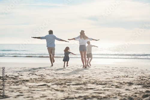 Beach, run and airplane with family back, play and adventure freedom by ocean on blue sky. Flying, game and children running with parents in Miami shore for holiday travel, trip and summer vacation